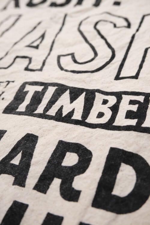 手刷りでスクリーンプリンティングしていますのでプリント位置やインクの入り具合(プリントかすれ)とプリンティング後に一度洗いをかけたシワ加工により、ひとつひとつ仕上がりが異なります。その違いを個性と味わいとご理解の上お愉しみください。
