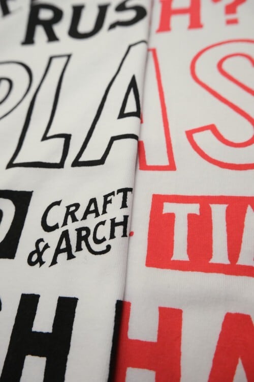 オーセンティックな100%コットン素材を使用、程よい厚みとタフな質感が特徴で使い込むほどに風合いが増していきます。※2026年3月より仕様を一部変更しました。生地の厚み(7.1oz)は同じですが、若干ライトな仕上がりになっています。また以前とサイズ感が異なりますので、リピート購入の方はサイズチャートをご確認ください。(Sサイズはございません)シルクスクリーンを用いて一枚ずつ手刷りでプリントしています。サイズはユニセックスです。"BLACK"『ブラック』と"RED"『レッド』の2色からお選びください。